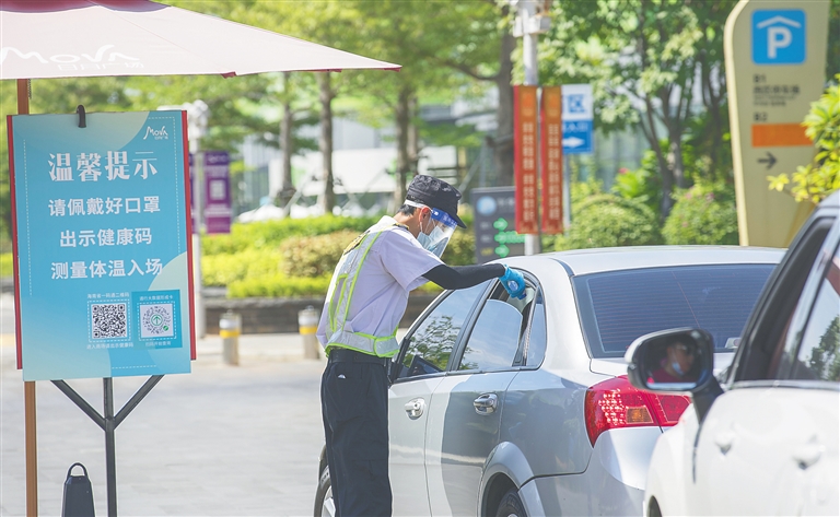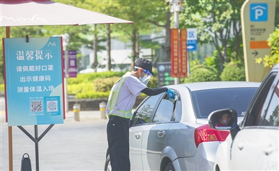 8月18日,在海口日月广场停车场入口处,工作人员测量车上人员体温并查验健康码。