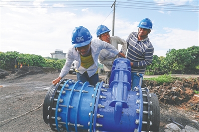 图为近日在海口市秀英区永兴镇儒吴村,工人翻动用于连接输水管道的闸阀。