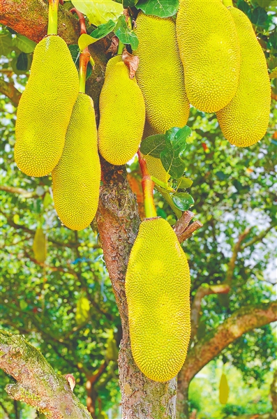 这种“甘愿”被种在人行道上、庭院内的植物,非常朴素,种子扔到哪儿就长在哪儿,无须悉心照看就能茁壮成长。《海南省志·农业志》介绍,解放初期,波罗蜜主要分布在琼山、文昌、屯昌、澄迈、定安等红土地区,而今已遍及全岛,从海拔16米到1600多米,到处都有。