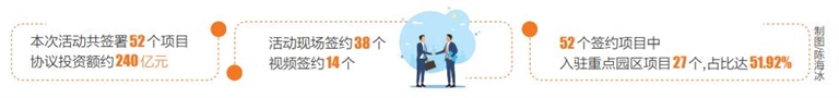 本次活动共签署52个项目,协议投资额约240亿元,“这些项目投资体量大,发展前景好,符合海南产业定位和发展需要,必将为海南自贸港建设和产业结构的优化升级注入新的活力。”省商务厅相关负责人表示。