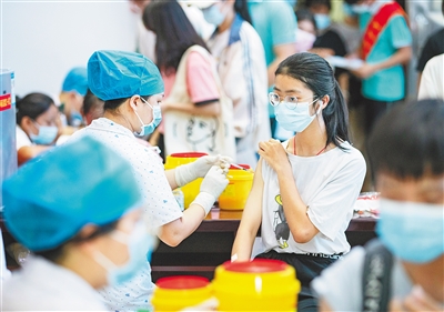 8月19日,在万宁中学接种点,学生有序到校接种第2针新冠疫苗。目前我省正稳步推进12岁至17岁青少年人群第2针接种工作。