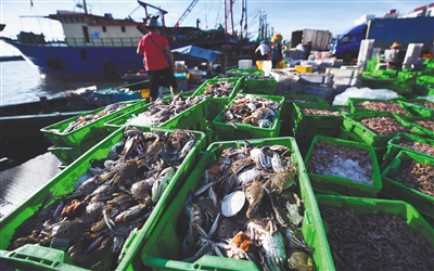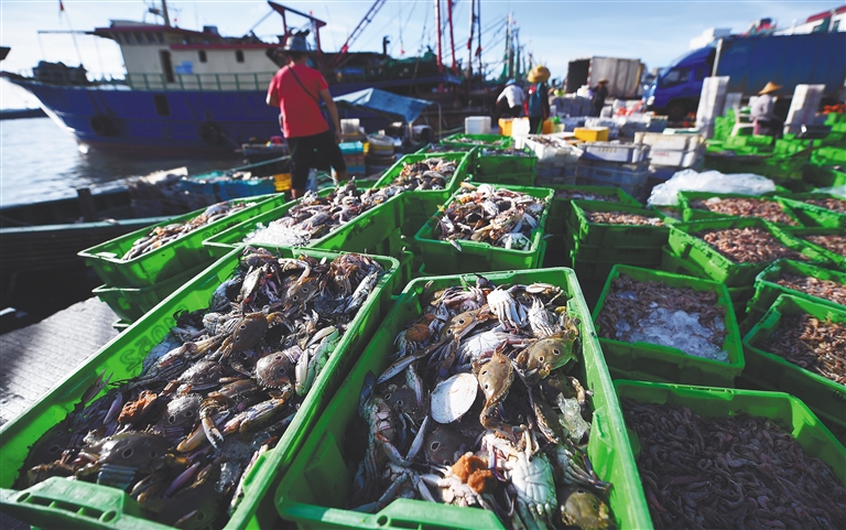 南海伏季休渔8月16日结束后,海南各地出海作业的渔船陆续满载而归,码头上到处可见渔民们丰收的喜悦,大批新鲜的海产品源源不断供应市场。 新华社记者 郭程 摄