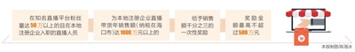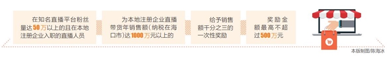 在知名直播平台粉丝量达50万以上的且在本地注册企业入职的直播人员,为本地注册企业直播带货年销售额(纳税在海口市)达1000万元以上的,给予销售额千分之三的一次性奖励,奖励金额最高不超过500万元。