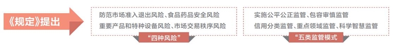 《规定》提出,监管机关应当建立与承诺即入制相适应的事中事后监管制度,健全监管规则和标准,创新和完善监管方式,对承诺即入商事主体的投资经营活动实施有效监管。防范市场准入退出风险、食品药品安全风险、重要产品和特种设备风险、市场交易秩序风险等“四种风险”,实施公平公正监管、包容审慎监管、信用分类监管、重点领域监管、科学智慧监管等“五类监管模式”。