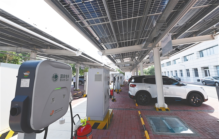 新能源汽车在天津津门湖新能源车综合服务中心充电(8月18日摄)。