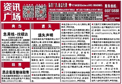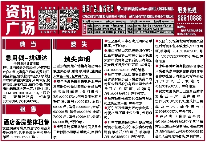 银达典当诚信经营23年,全国连锁分店25家,办理房产、汽车、名表、钻石、黄金、铂金、股票、数码产品及大宗房地产项目等典当贷款业务。正规专业、快速灵活、高额低息。海口公司:国贸玉沙路椰城大厦一层。68541188、68541288、13307529219。三亚公司:三亚解放路第三市场旁 88558868,13518885998。