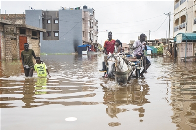 8月20日,人们在塞内加尔达喀尔涉水前行。受近日强降雨影响,达喀尔遭遇洪涝灾害。 新华社/法新
