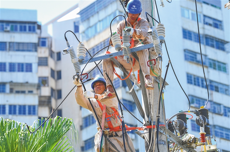 近日,在海口市白龙南路,南方电网海南海口供电局工作人员在安装配网自动化真空开关。