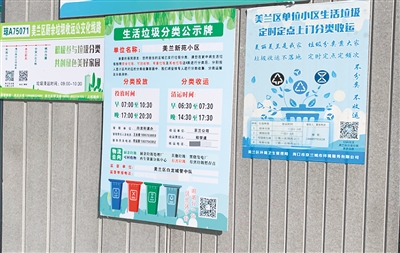 在美兰新苑小区垃圾分类驿站,有一张特殊厨余垃圾车“公交站牌”。牌上对外公布了该点位厨余垃圾收运车辆的车牌号码、收运路线图、收运时间和监督电话。