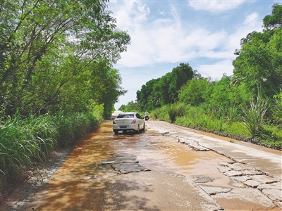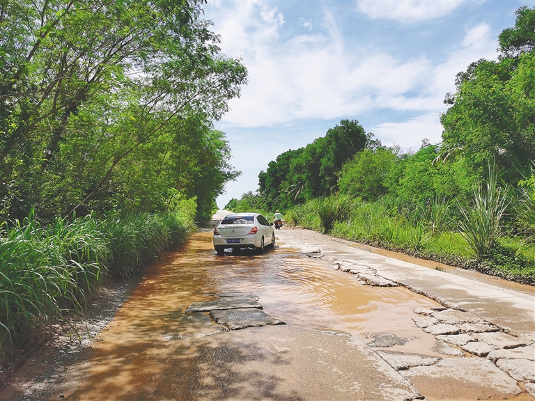海南日报记者在现场看到,这是一条宽约10米的公路。进入Y038乡道后,采访车刚刚行驶不到10米,即被道路中间一个大坑拦住。司机下车查看情况后,才小心翼翼地从道路边缘穿过。车辆继续向龙湾港方向驶去,几乎每隔10米就会有一段坑洼路面。在4公里行程中,车子行驶了20多分钟,司机先后5次下车查看路况,以免车辆底盘被刮。