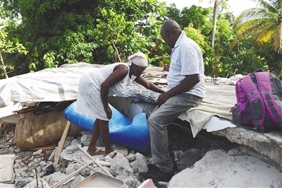 8月22日,人们在海地马瑟林查看地震中受损的房屋。