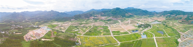 在海垦南繁土地开发整理项目(二期)现场,从空中俯瞰,刚平整的土地层层叠叠高低错落。然而在短短两三个月前,这里还是一片杂乱的无规划土地。
