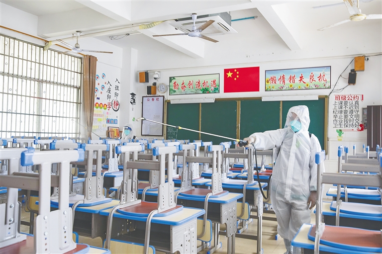 8月24日,万宁中学的消杀人员给学生课桌椅喷洒消毒剂。当天该校开展校园公共区域全方位消杀工作,切实做好开学前疫情防控工作。本报记者 袁琛 通讯员 杨师忠 文/图