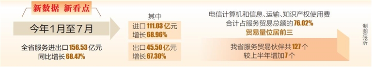据统计,今年1月至7月,全省服务进出口156.53亿元,同比增长68.47%。其中,进口111.03亿元,增长68.96%;出口45.50亿元,增长67.30%。从板块结构上看,贸易量位居前三名的板块分别为电信计算机和信息、运输、知识产权使用费,合计占服务贸易总额的76.02%。