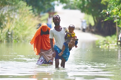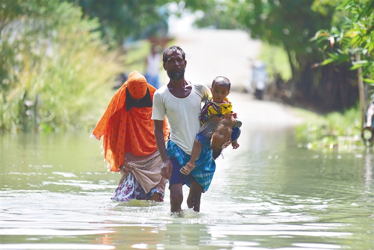 8月28日,在印度阿萨姆邦一个洪水泛滥的村庄,人们涉水前行。