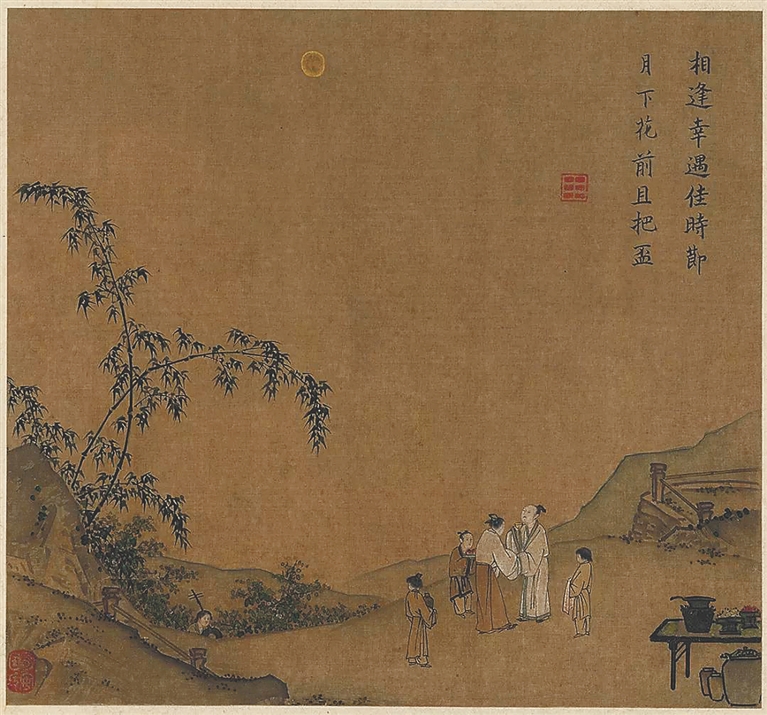 南宋·马远的《月下把杯图》,画幅温馨和暖,融乐欢洽,枝枝叶叶摇曳的绿意在清秋里续写着夏的生机。画作乃中秋美景之夜,一轮圆月高悬夜空,月下空旷的山林幽雅静谧,天地之间月朗明透,安静的夜色秋意欢浓。多年不见的远方好友中秋来访,与主人披着月色在庭院中握手而暄,道不尽的话语随中秋月光缓缓流淌。又有一孩童在一旁凝神而立,还有一侍酒小童,正在回望另一侍琴迈上台阶的半隐文童,佳节好友之幸遇,给整幅动感十足的画面,增添了无尽的秋思与人文情愫。为招待好友的到访,熙和的小院里,主人早就备好了飘香的酒菜,一幅饱含友情的月下把杯图,就这样铺展在人们的视野里。南宋画家马远的这幅经典名画,以和谐的笔法,将秋日的生机与佳节的温情融为一体,细细赏之,品思无尽。
