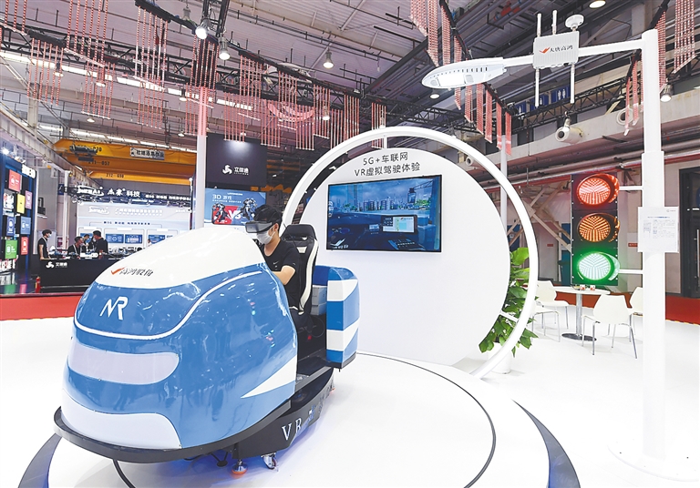 8月31日, 在2021世界5G大会展览现场,媒体从业人员体验5G+车联网VR虚拟驾驶。