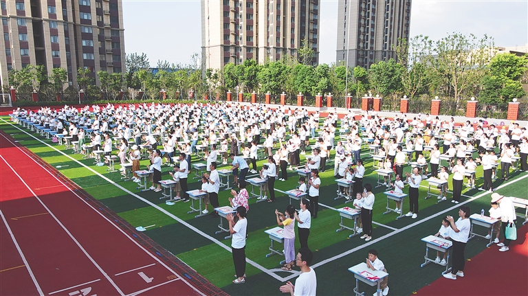 8月31日,在合肥师范学院附属实验小学,家长带着一年级新生一起参加“入学礼”(无人机照片)。