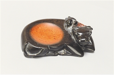 此砚造型独特,生动可爱。线条圆滑,泥质细润,周身外表漆黑发亮,牛背为砚池,砚池橘红色。牧牛澄泥砚是明代进贡朝廷的一个砚种,也是明代澄泥砚中不可多得的珍品。