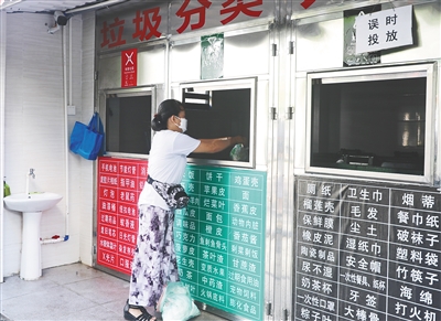 笔者走进垃圾分类屋,看到屋内摆设干净整洁。分类屋的垃圾间除了用玻璃隔开形成独立的空间外,还配置专用的除臭设备,投放窗口采用感应自动升降方式。同时,垃圾分类收集屋屋前设有厨余垃圾、有害垃圾、其他垃圾、可回收物4个投放窗口,每个窗口还有垃圾分类详细标识,清晰简明地指导居民将分类好的垃圾进行投放。此外,垃圾分类屋的旁边还设有洗手池,方便居民在投放垃圾后及时清洁手部卫生。