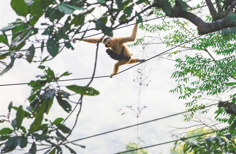 帮助海南长臂猿跨越沟谷的绳索,能连接独立成片的“孤岛”雨林,扩大这些雨林精灵的活动觅食区域,而这只是人类为了恢复海南长臂猿种群数量所采取的保育措施之一。海南热带雨林生态廊道的初步形成,让碎片化的海南长臂猿栖息地变得更加完整。