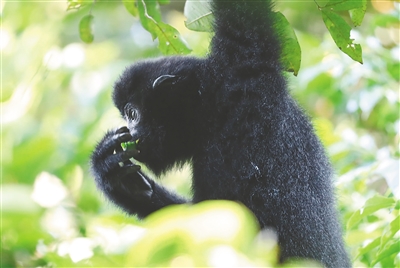 与人类的另一个相似点是,海南长臂猿进食时坚持“女士优先”。每次进食,母猿尤其是带有幼崽的母猿会先吃,公猿则在一旁戒备,待母猿吃饱后才轮到公猿吃。