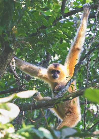 海南长臂猿拥有一身好“轻功”,擅长“臂荡式”飞跃。双臂交叉摆荡在树冠间,一个摆臂便能荡到十几米开外。对它们而言,在广袤的热带雨林里,双臂是最好的“交通工具”。