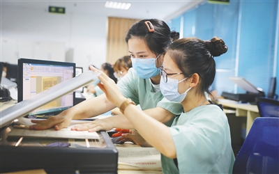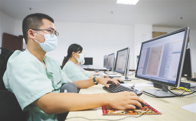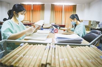 档案扫描完成后,开始进行图像处理。图像拼接、旋转裁边、图像质量检查……不同于美编,档案图像处理遵循的首要原则是保持档案原貌。现场数十名工作人员小心翼翼、精益求精,专注处理自己手头的档案,对于那些起皱的地方,他们一一还原。接着,再经过编目、质检、装订入库等步骤,一份份档案就完成了数字化加工。