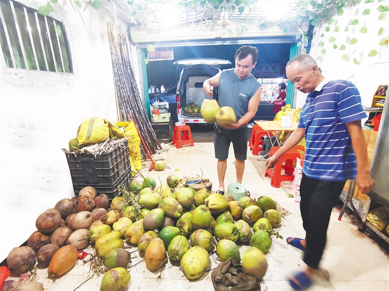 “我这里兼顾批发和零售,批发的话我就卖10.5元/个,零售就是11元/个,椰子水一杯是12元。” 黎辉勇说,砍椰子、清椰子壳比较麻烦,耗人力,铺租贵,“像我们这样的小店,售价要卖到15元/个左右才能有钱赚。”