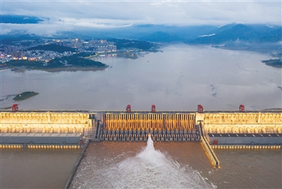 图为9月6日,三峡枢纽开启泄洪孔泄洪。
