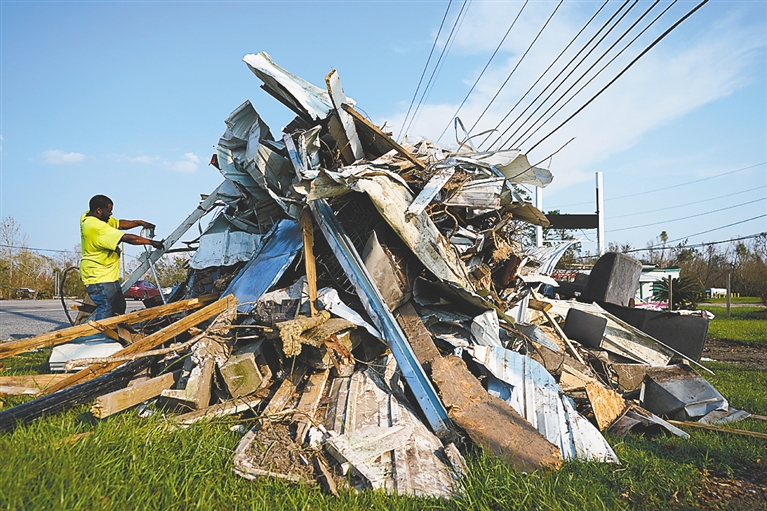 9月5日,一名男子在美国路易斯安那州翻查堆放在街边的被损毁的家具。