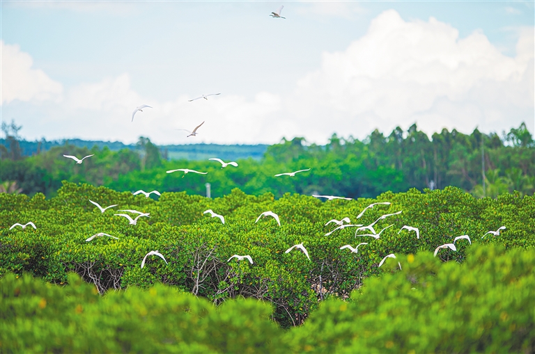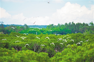 9月7日,在儋州市的海南新盈红树林国家湿地公园,各类候鸟翩翩而至。
