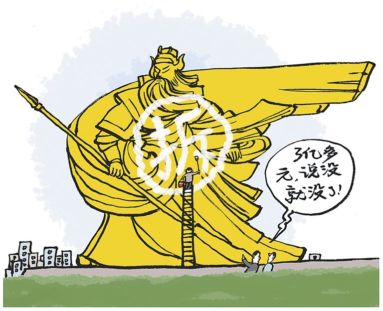 被住房和城乡建设部通报批评的湖北省荆州市巨型关公雕像日前开始拆卸转移,搬移工程总投资1.55亿元。关公雕像建成于2016年,总造价达1.729亿元。先是违建、后又搬移,3亿多元就这样浪费了。