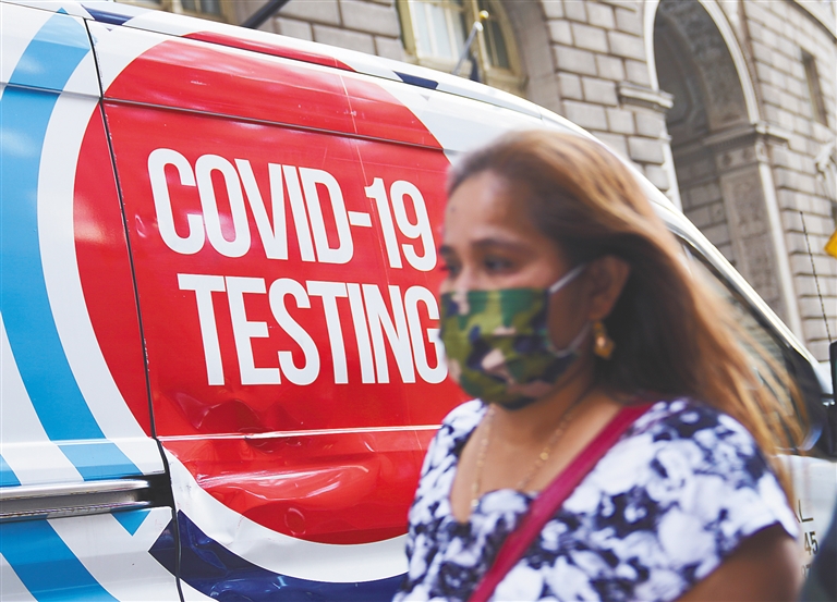 9月6日,一名女子从美国纽约的移动新冠检测点旁经过。