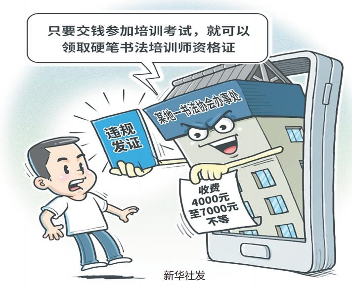 不久前,有群众在国务院“互联网+督查”平台反映,有自称“中国硬笔书法协会天津办事处工委”的机构,在网上发布招生简章和广告,组织开展硬笔书法等级考试并以中国硬笔书法协会名义颁发“硬笔书法培训师资格证书”及其他证书,收费从几百元至几千元不等。