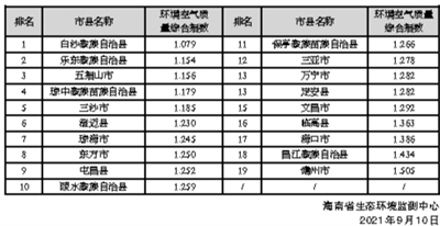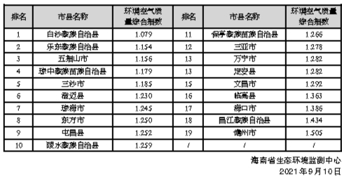 环境空气质量排名靠前的市县分别是白沙黎族自治县、乐东黎族自治县和五指山市,排名靠后的市县分别是儋州市、昌江黎族自治县和海口市。2021年8月全省19个市县环境空气质量排名如右: