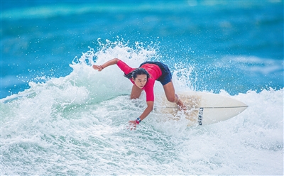 今年21岁的黄莹莹来自万宁,她的家就在日月湾畔的田新村。比赛前,黄莹莹说,她常年在日月湾训练,对这片海域很熟悉,力争为海南代表团夺得金牌。“这次取得金牌并不是我一个人的荣誉。”黄莹莹在赛后表示,此次全运会冲浪赛好手众多,比赛非常激烈,“感觉自己表现得还不错,把平时训练的水平都顺利发挥出来了。”