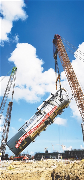 据了解,在急冷水塔完成吊装后,下一个吊装的塔器为急冷水塔旁边的急冷油塔。目前急冷油塔正在抓紧进行“穿衣戴帽”安装施工,预计9月16日进行吊装。届时,乙烯项目实现“急冷双塔”完成吊装工作,为下一阶段的施工创造条件,确保项目明年9月30日竣工投产。