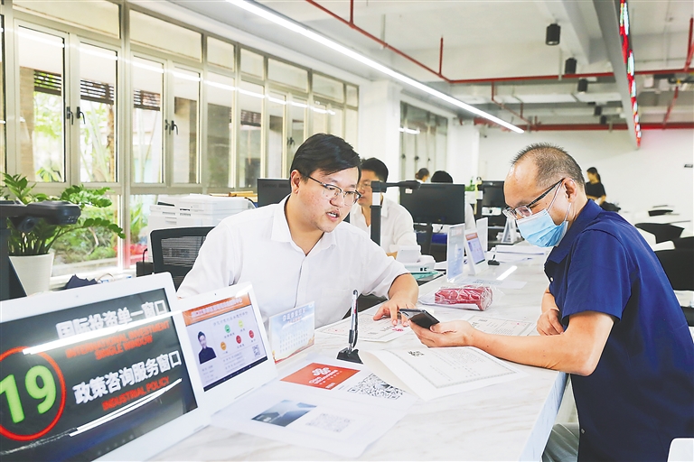 近日,在海口江东新区政务服务中心,工作人员给企业办理入驻业务。