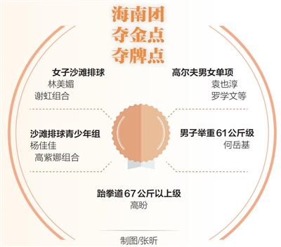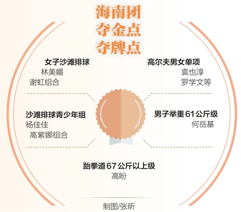 在高尔夫球比赛中,海南队具备了冲击奖牌的可能。高尔夫比赛设男女团体和单项共4枚金牌。海南队的袁也淳参加了东京奥运会,不过,由于奥运会后所有的中国队选手都进行了28天的隔离,这多少会影响他的状态。海南高尔夫球队在最近两年的全国锦标赛上发挥较为稳定,一直稳居“第一方阵”。海南队的罗学文、金大星、张芸杰和杜墨含有望冲击男女单项奖牌。