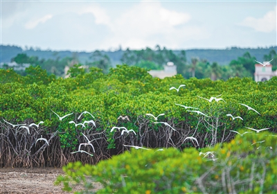 “算算时间,已经涨潮了,我带你们看看在生境塘上休息的鸟儿!”9月11日下午3时许,暴雨骤停,位于儋州市光村镇的海南新盈红树林国家湿地公园,青草香弥漫,巡护员罗理想兴致勃勃地邀请我一同探秘。