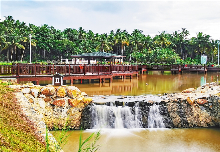 椰影婆娑,绿水环绕,这是踏进村子的第一印象。再定睛细看,慢道、栈桥、湖心亭,嬉戏的孩童背后,一大片飘着稻香的田园,好一幅世外桃源般的美丽乡村图景。