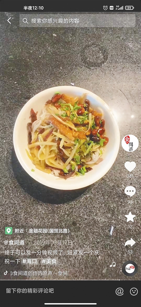 有一个名为“食间道”的海南本土美食抖音号,关注文昌鸡、海南粉等非遗美食及其他特色美食,已发布了500多条探店视频,累计获赞超110万,粉丝达15.7万,影响力可见一斑。