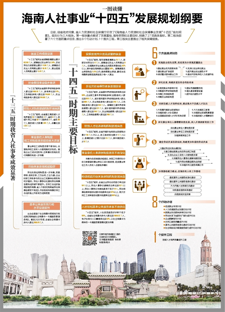 日前,经省政府同意,省人力资源和社会保障厅印发了《海南省人力资源和社会保障事业发展“十四五”规划纲要》。规划分为三大板块。第一板块重点阐述了发展基础、指导思想和主要目标,明确了27项具体指标。第二板块部署了六个方面的重点任务,提出8个行动计划、1个提升工程。第三板块主要提出了相关保障措施。