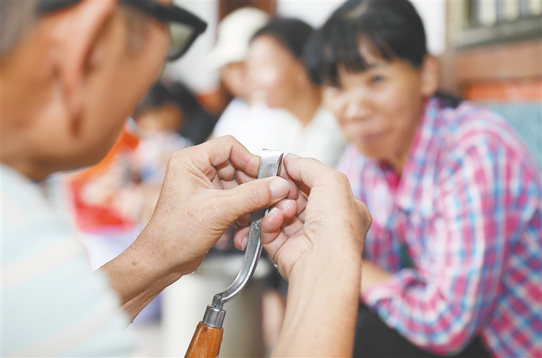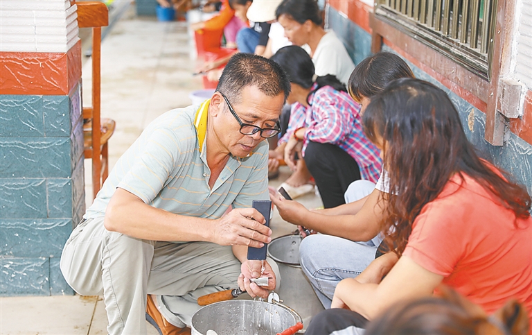 近日,在白沙黎族自治县七纺镇那来村,培训老师为胶农讲授打磨推式割胶刀的技巧。据了解,为增加胶农的收益,助力乡村振兴发展,白沙持续推动农村橡胶管护技术培训。每期培训持续5天,前2天培训磨胶刀,后3天进行割胶实操,今年预计可以培训1200名胶农。本报记者 李天平 摄