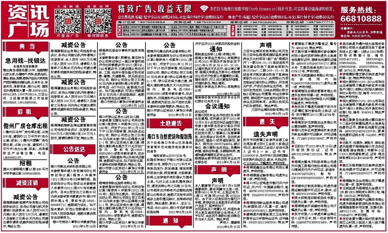●王和永(于2021年9月13日)遗失居民身份证,证号:460102199401161214,特此声明。