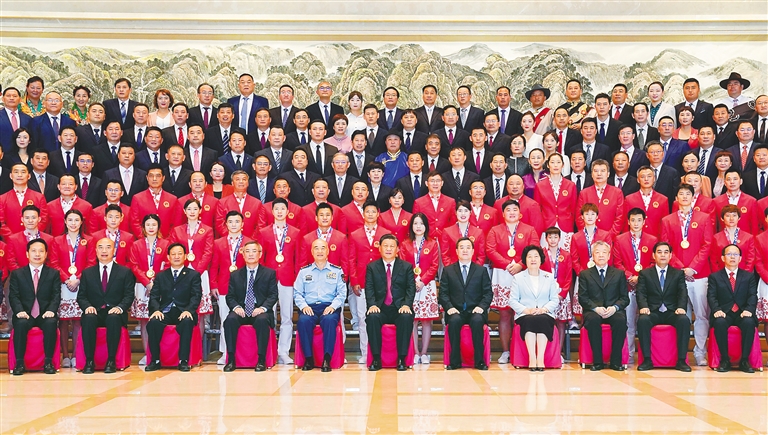 15日下午,习近平在陕西大会堂亲切会见了全国群众体育先进单位、先进个人代表和全国体育系统先进集体、先进工作者代表,东京奥运会中国体育代表团运动员和教练员代表等,并同大家合影留念。习近平同大家亲切交流,勉励他们奋力拼搏、再创佳绩。