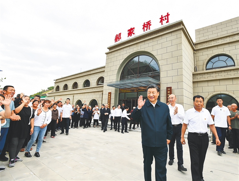 9月13日至14日,中共中央总书记、国家主席、中央军委主席习近平在陕西省榆林市考察。这是14日下午,习近平在绥德县张家砭镇郝家桥村考察时,向乡亲们挥手致意。 新华社记者 谢环驰 摄