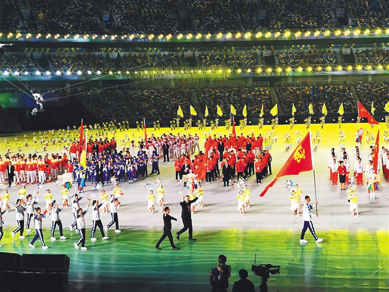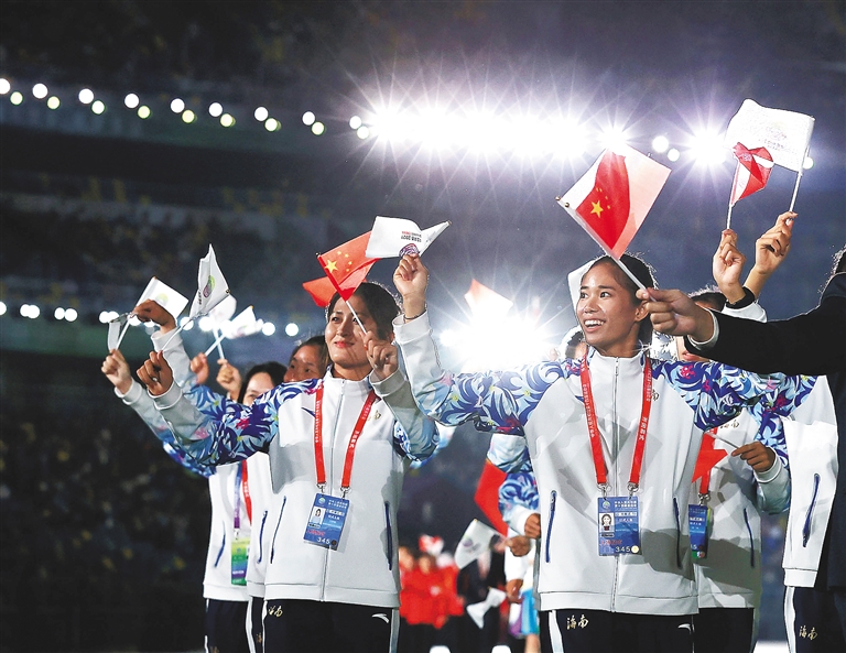 本报西安9月15日电 (特派记者王黎刚)第十四届全国运动会开幕式15日晚在陕西省西安市举行,海南体育代表团在旗手、东京奥运会铜牌获得者毕焜的率领下,第21位出场。在此前结束的比赛中,海南团已经获得了3金1银。