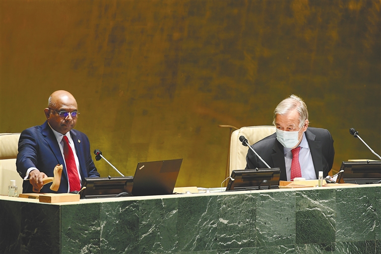 9月14日,在位于纽约的联合国总部,第76届联合国大会主席阿卜杜拉·沙希德(左)和联合国秘书长古特雷斯出席第76届联大第一次全会。 第76届联合国大会14日在纽约联合国总部开幕。新华社发